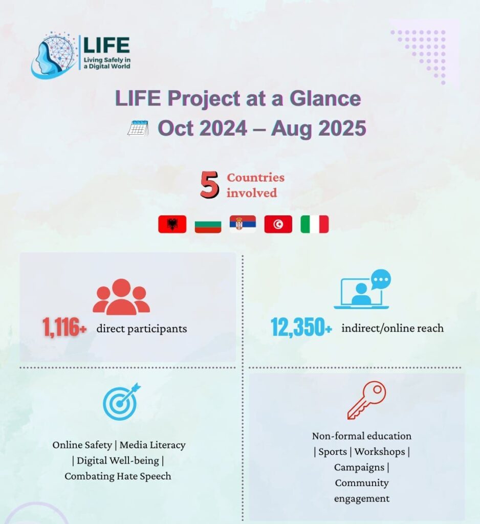 The LIFE Comparative Report 2025 brings together the collective findings of national monitoring efforts conducted across Albania, Bulgaria, Italy, Serbia, and Tunisia, offering a comprehensive cross-country analysis of online hate speech and harmful digital discourse. Building on evidence gathered at national level, the report identifies common trends, emerging risks, and country-specific dynamics, while highlighting good practices and policy-relevant insights. By combining quantitative data with qualitative assessment, the report supports informed decision-making and contributes to a deeper understanding of digital safety challenges, fostering cooperation among civil society, policymakers, and practitioners at both national and European levels.