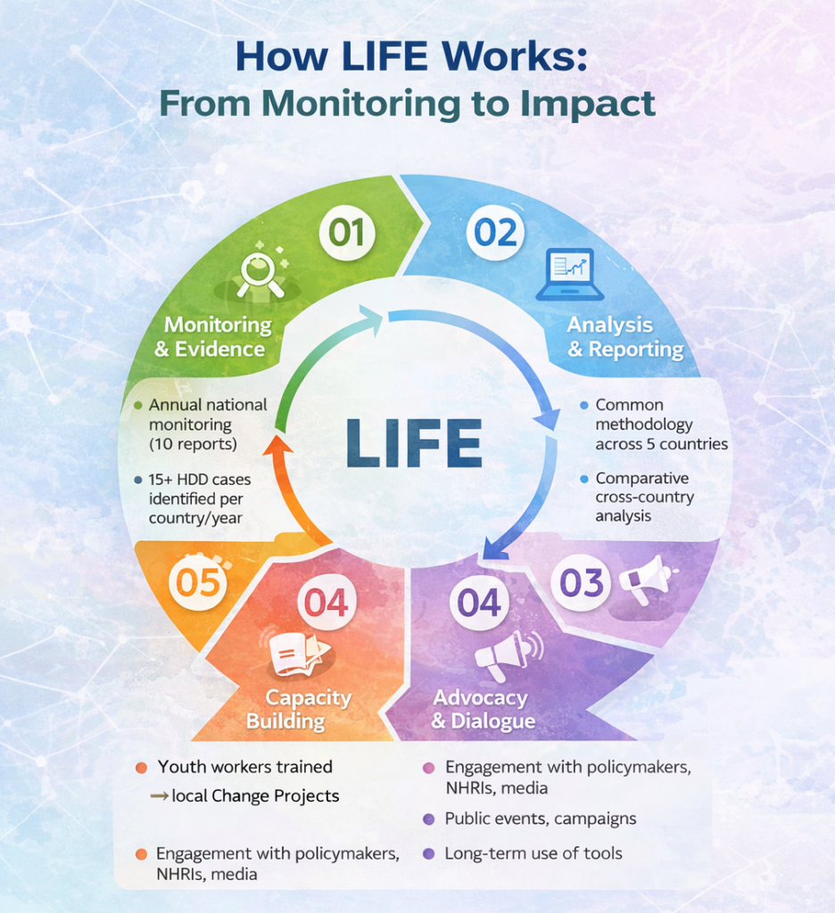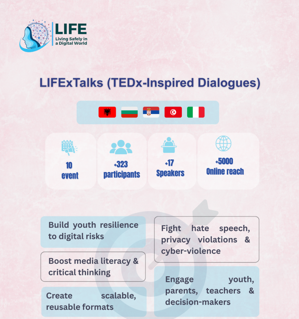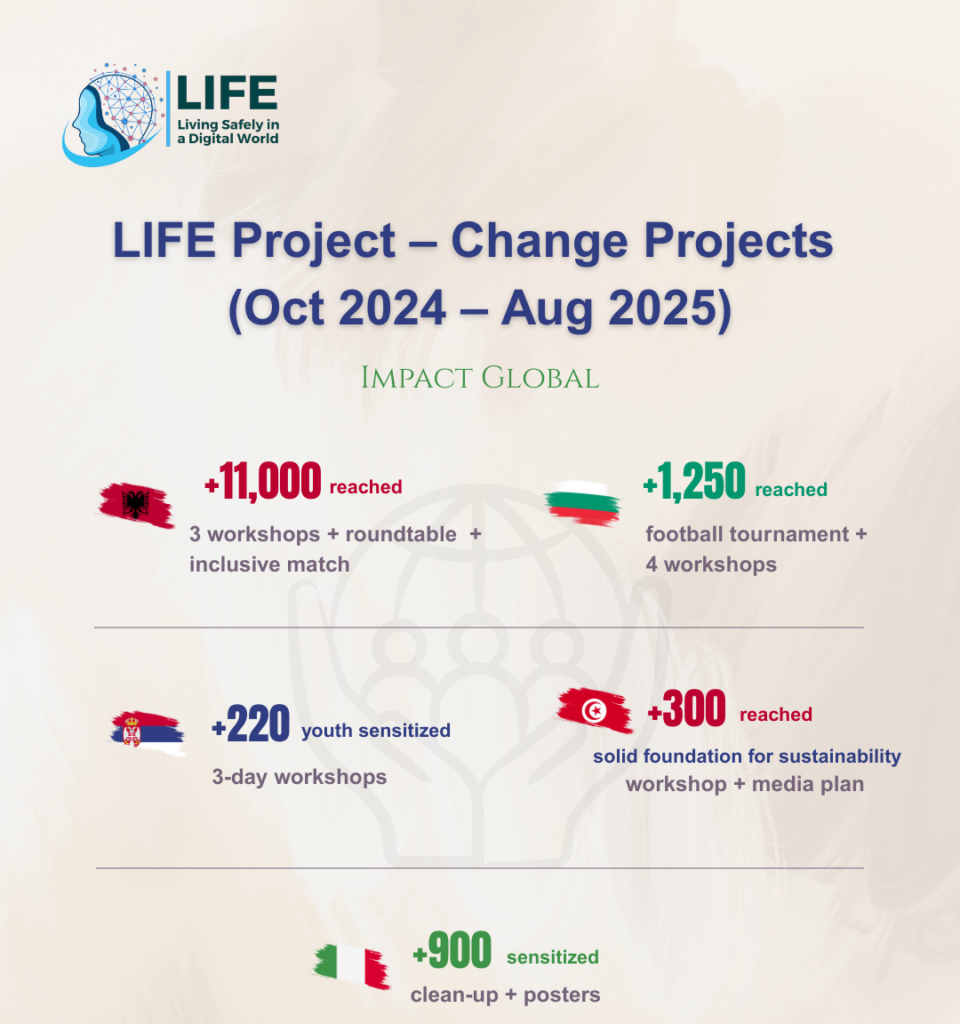 This section presents a curated collection of LIFE project infographics, offering a clear and visual overview of key results, activities, and impacts achieved across partner countries. Through concise data visualisation, these infographics highlight project milestones, participation figures, thematic focus areas, and outcomes of LIFE Talks, change projects, and capacity-building actions. Designed to enhance accessibility and understanding, they translate complex data into engaging visuals that support transparency, dissemination, and evidence-based communication at national and European levels.